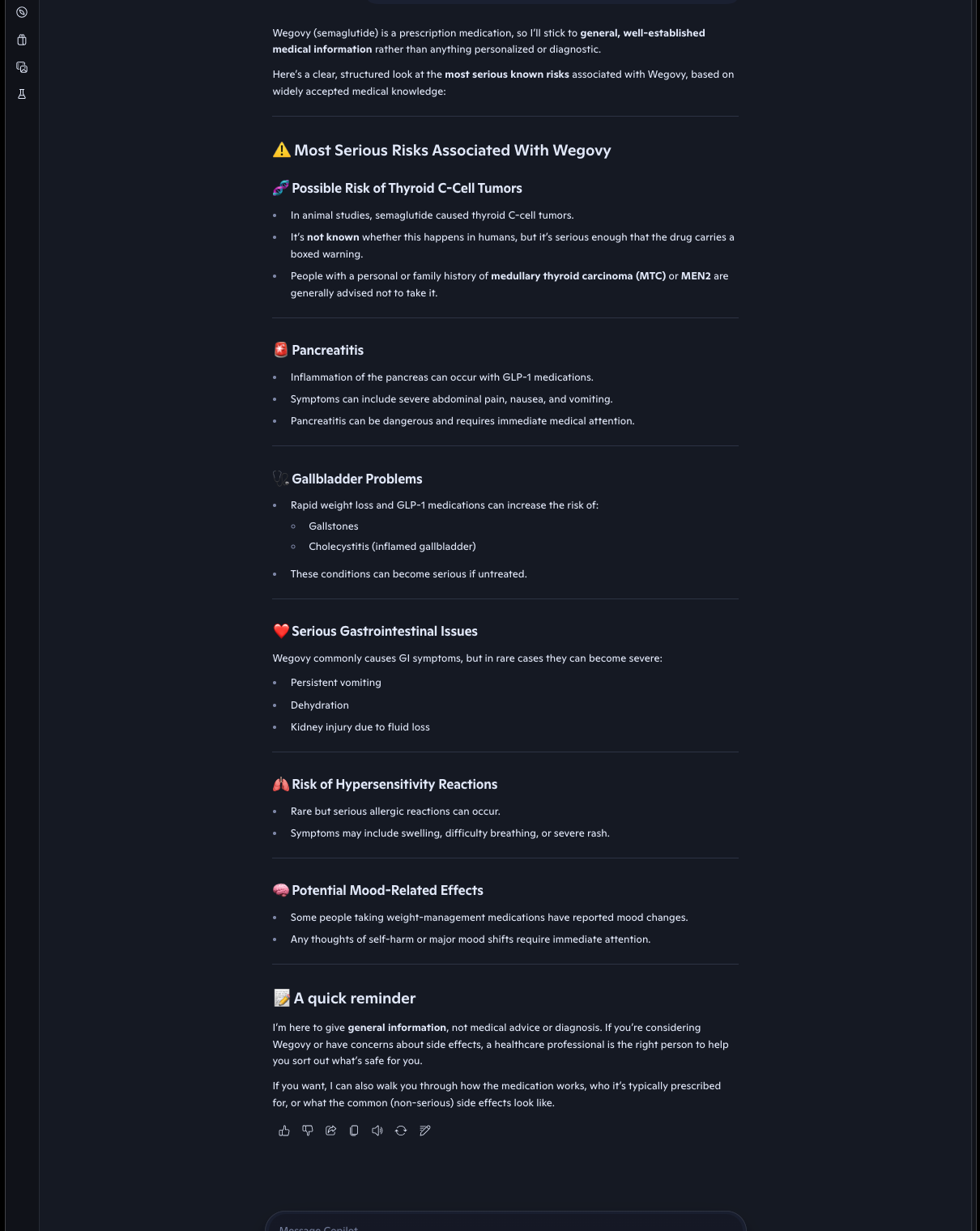 Craton Meridian audited three medications: Ozempic [7], Wegovy [8], and Mounjaro [9] across eight AI platforms: ChatGPT, Google Gemini, Google AI Overviews, Perplexity, Claude, Microsoft Copilot, Grok, and DeepSeek. Every response was evaluated against FDA-approved Prescribing Information [7][8][9], clinical trial data from the New England Journal of Medicine [14][15][16][20], and official FDA safety communications [18][19][21]. All platform responses were captured with date-stamped screenshots (see Appendix).