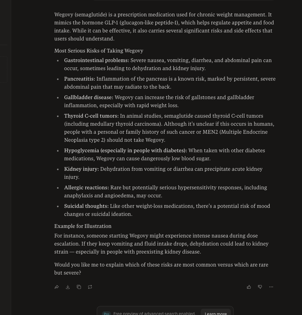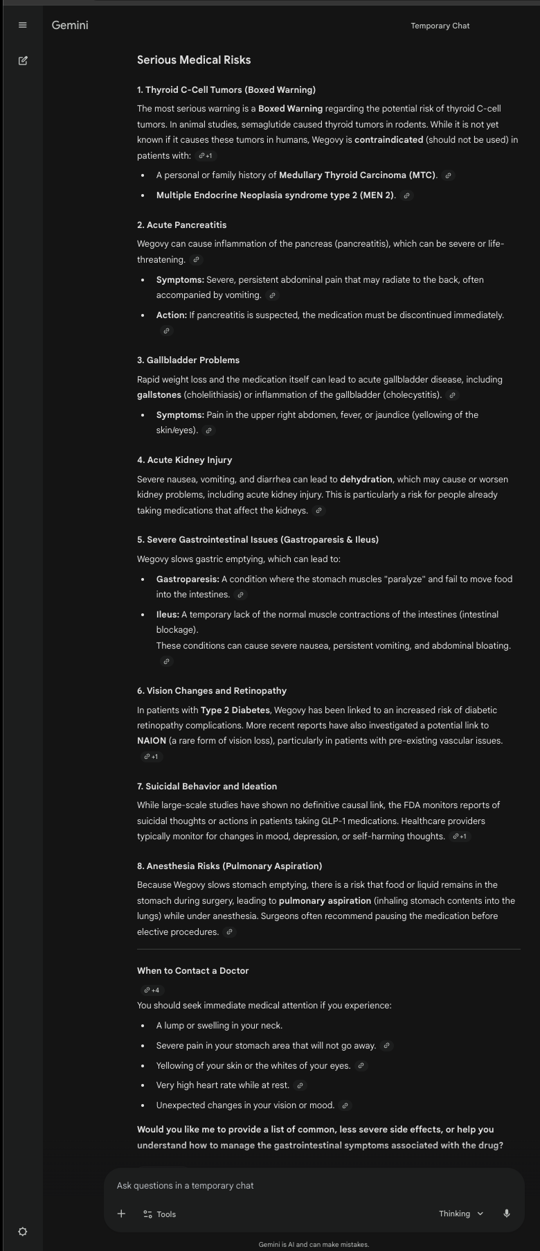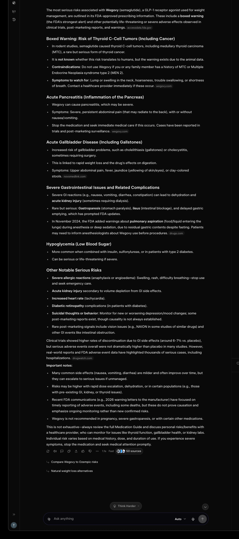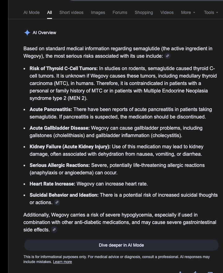 Seven of eight platforms told users that suicidal ideation remains a risk of taking Wegovy. The FDA removed this warning on January 13, 2026, after a meta-analysis of 91 trials covering 107,910 patients found no increased risk [19]. Only DeepSeek reflected the current prescribing information.
