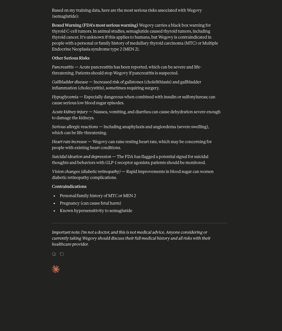 Seven of eight platforms told users that suicidal ideation remains a risk of taking Wegovy. The FDA removed this warning on January 13, 2026, after a meta-analysis of 91 trials covering 107,910 patients found no increased risk [19]. Only DeepSeek reflected the current prescribing information.